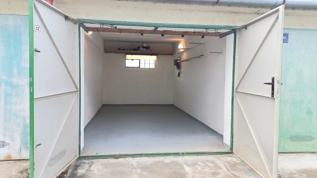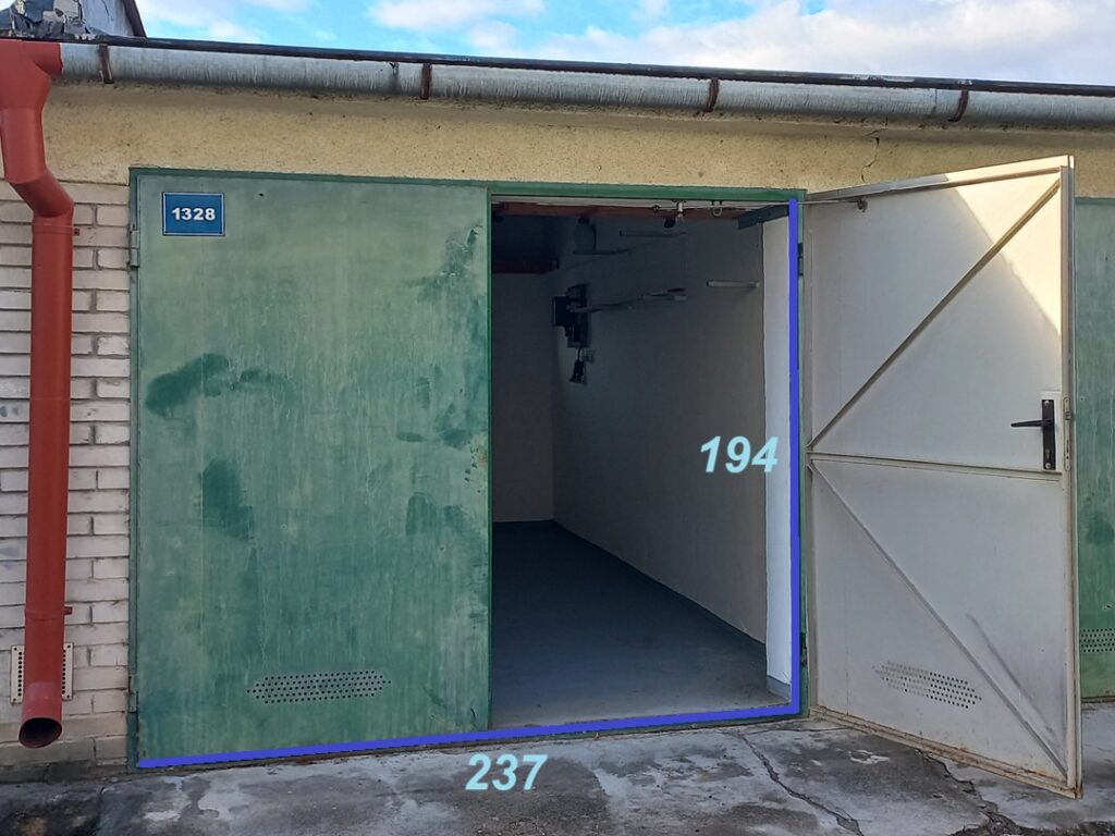Jedná se o cihlovou stavbu horní část patrové řadové garáže (vrata č.1328) s plochou střechou (krytí asfaltovou lepenkou). Postaveno v r.1990, betonová podlaha, plechová vrata, osvětlení a zásuvky v přední i zadní části garáže, elektřina 380 V (podružný elektroměr). Vnitřní plocha je cca 17 m2 (2,8 x 5,9 m), výška: 2,25 m (vpředu u vrat), 2,5 m vzadu. Rozměry vrat: šířka 2,37 m, výška 1,94 m, stěny vymalované.